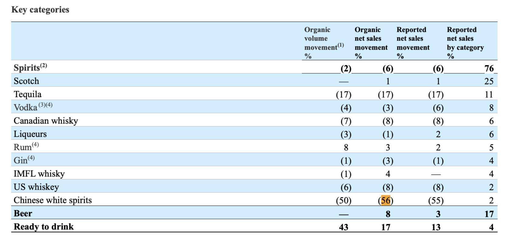 从品类看,烈酒总销售额有机下降6%,其中中国白酒下滑56%、龙舌兰下降17%,但啤酒类别增长8%,即饮饮料更飙升17%。
